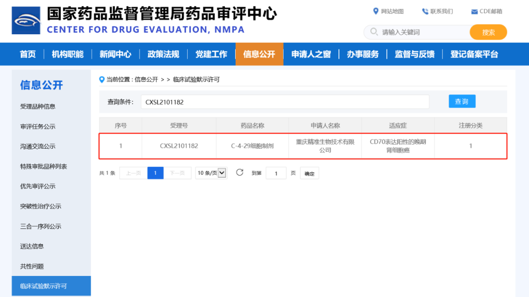 国内首个:C-4-29细胞制剂肾细胞癌实体瘤适应症获临床试验默示许可