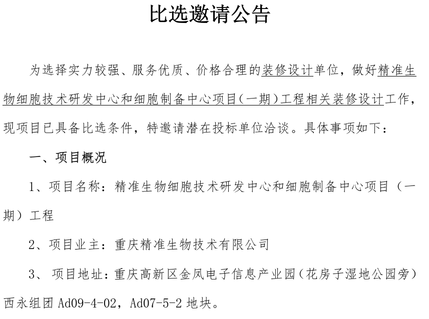 为选择实力较强、服务优质、价格合理的装修设计单位,做好j9.com生物细胞技术研发中心和细胞制备中心项目(一期)工程相关装修设计工作,现项目已具备比选条件,特邀请潜在投标单位洽谈。具体事项如下:一、项目概况1、...